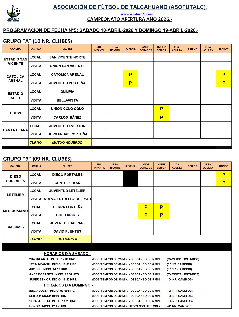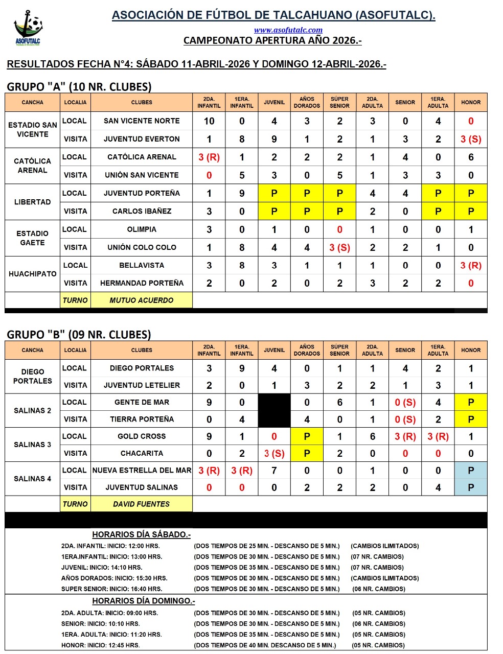 Resultados Fecha N°4: sábado 11-abril y domingo 12-abril. Rival: Juventud Salinas en Salinas 4.