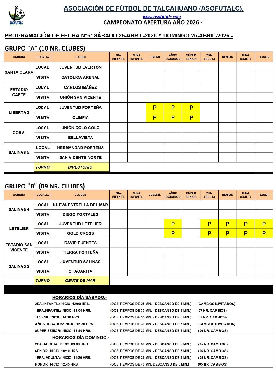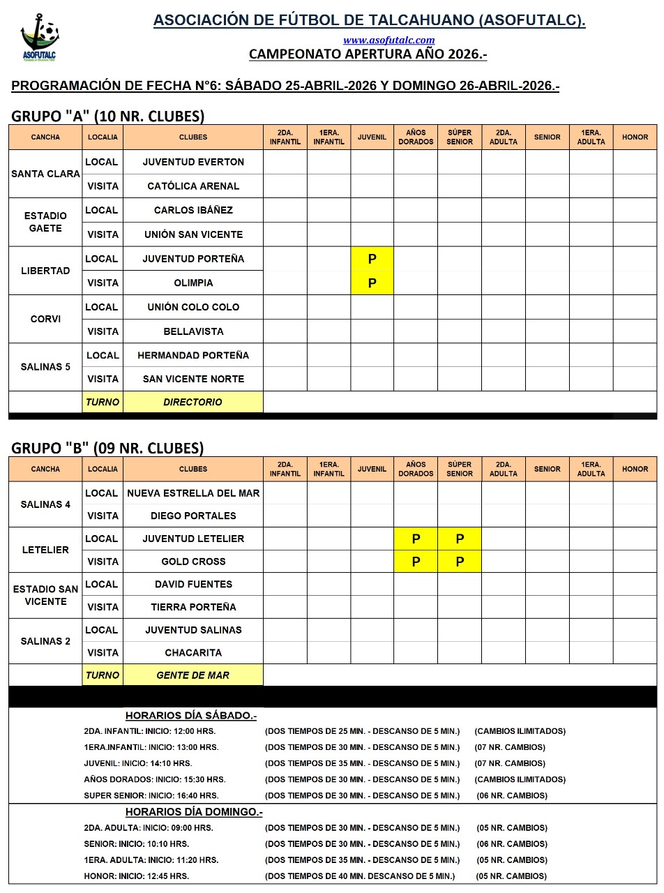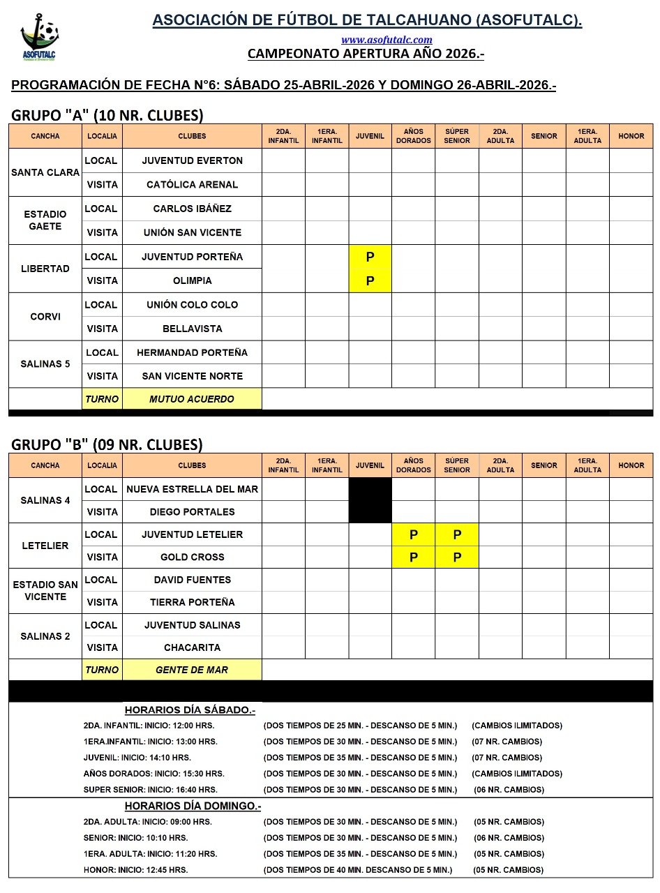 Programación Fecha N°6: sábado 25-abril y domingo 26-abril. Rival: Diego Portales en Salinas 4.