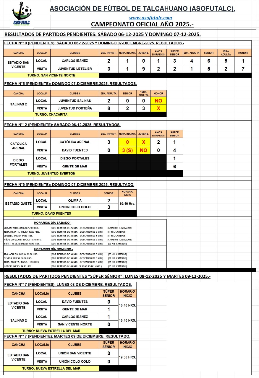 Resultados Partidos Pendientes sábado 06; domingo 07; lunes 08 y martes 09-12-25.