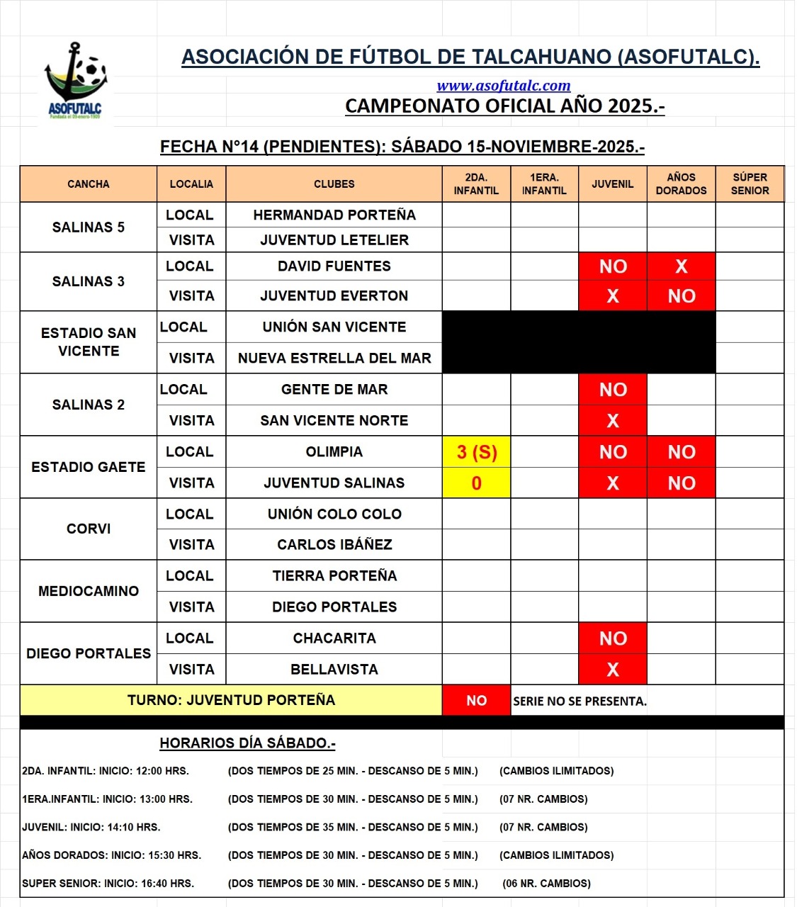 Programación de la Fecha N°14 (Pendiente): sábado 15-noviembre-25.-
