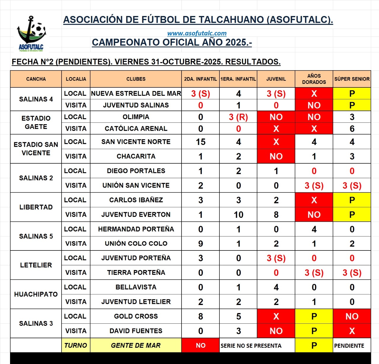 Resultados de la Fecha N°2 (Pendiente); viernes 31-octubre-25.-