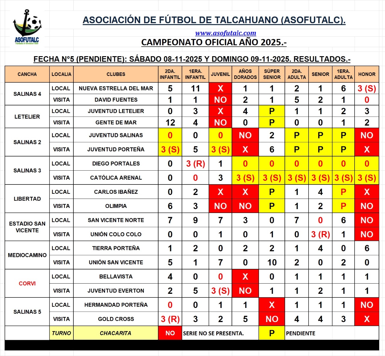 Resultados de la Fecha N°5 (Pendiente): sábado 08 y domingo 09-noviembre-25.-