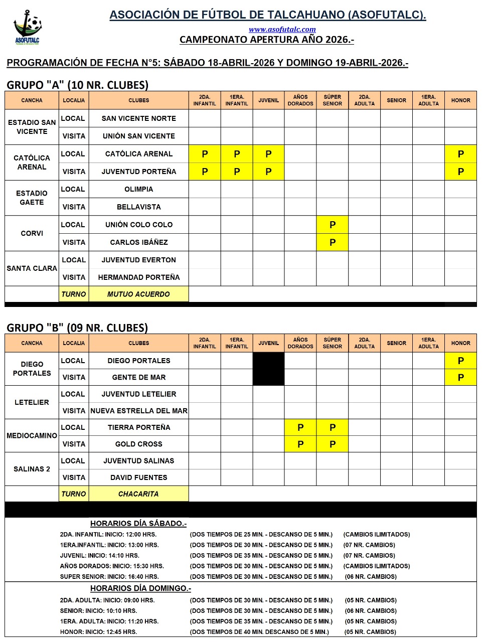 Programación Fecha N°5: sábado 18-abril y domingo 19-abril.