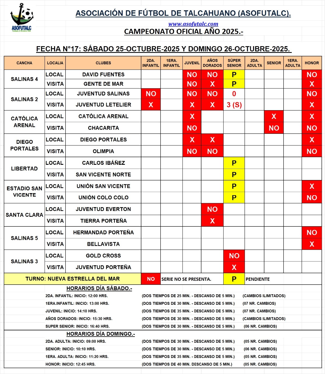 Programación de la Fecha N°17; sábado 25 y domingo 26-octubre-25.-