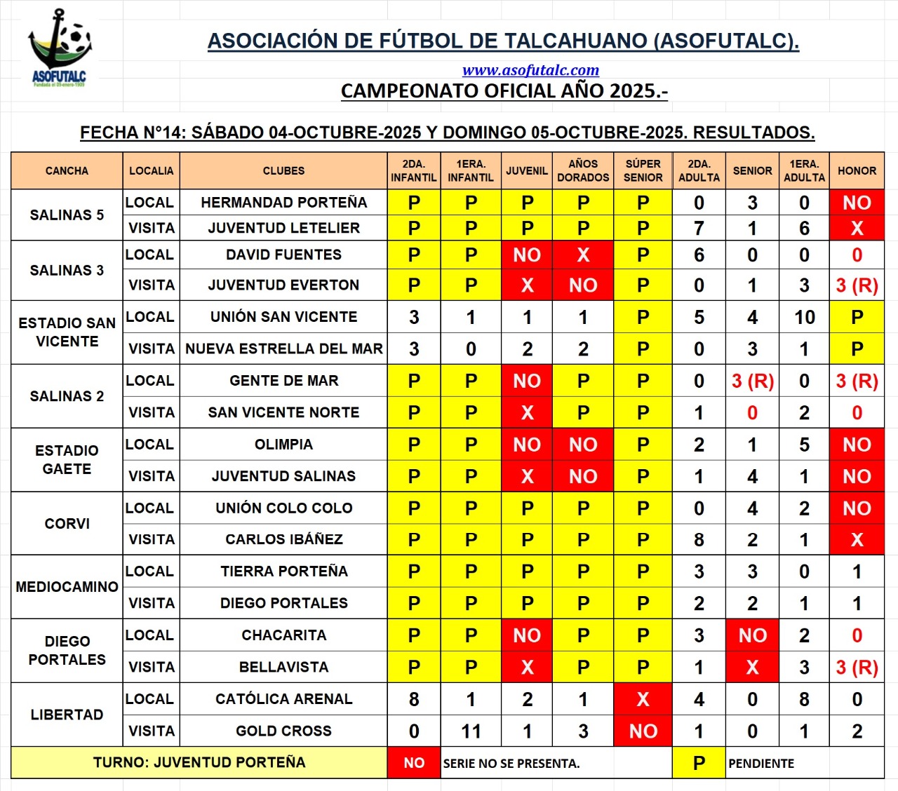 Resultados de la Fecha N°14; sábado 04 y domingo 05-octubre-25.-