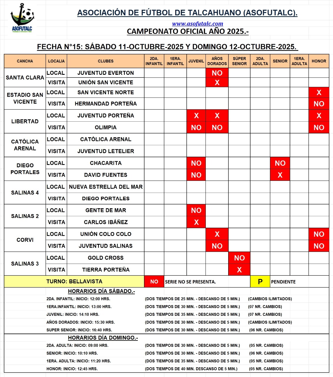 Programación de la Fecha N°15 sábado 11 y domingo 12-octubre-25.-